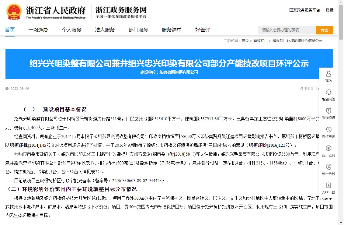 紹興興明染整有限公司兼并紹興忠興印染有限公司部分產(chǎn)能技改項(xiàng)目環(huán)評(píng)公示